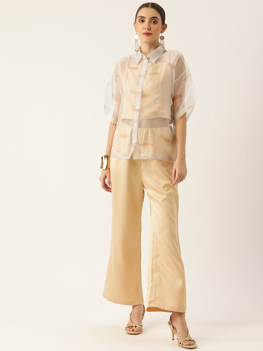 Women Off White Printed Solid Polyester Collared Co-Ord Set